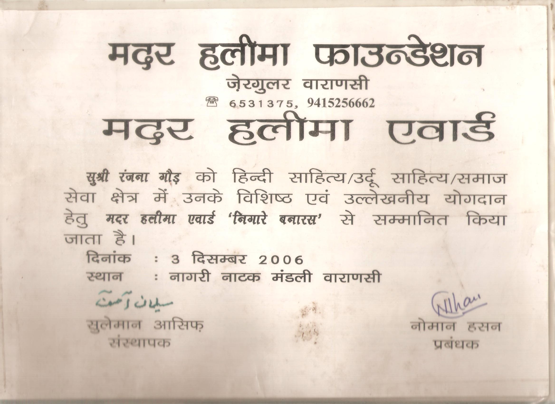 RASHTRIYA NARI SEWA SAMMAN” – 26th June 2005 by Human Rights and Antinarcotics Crime prevention Investigation Bureau.