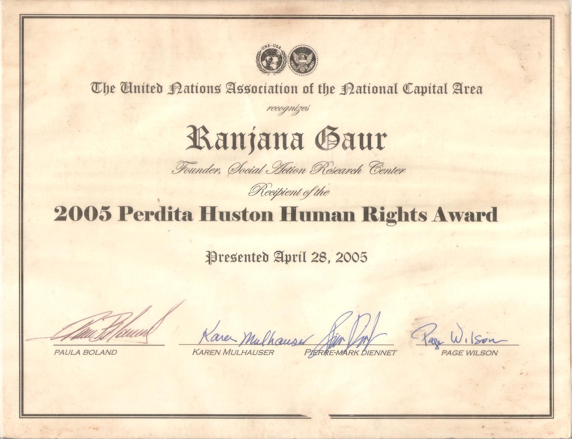 PERDITA HUSTON HUMAN RIGHTS AWARD” – 28th April 2005 in Washington DC, USA.
